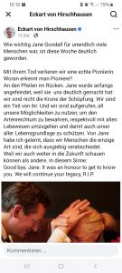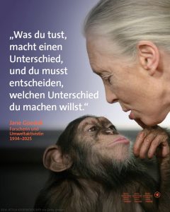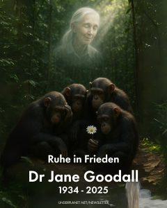 - Heute am 08.10.2025, eine Woche nach Jane Godalls Sterbetag habe ich 7 Gründe um meine 22 Jahre alte Webseite erneut zu aktualisieren. Ich fasse mich kurz, da diese Gesellschaft resistent gegen Warnungen und Aufklärung ist […]. Versuchen kann man es ja trotzdem mal. Meine Empfehlungen: