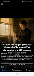 Einer der Hauptgründe ist ein Post von „Nachhaltig“ über Eunice Newton Foot, die vor 168 Jahren den Zusammenhang zwischen Kohlendioxid und Wärme (Treibhauseffekt) entdeckte. Weiter unten in dem Beitrag schrieb ich vor einigen Wochen, dass der Treibhauseffekt vermutlich schon seit ca. 200 Jahren bekannt ist. Hierzu möchte ich den Link von dem Post vom 17.09.2025 hier einfügen:
